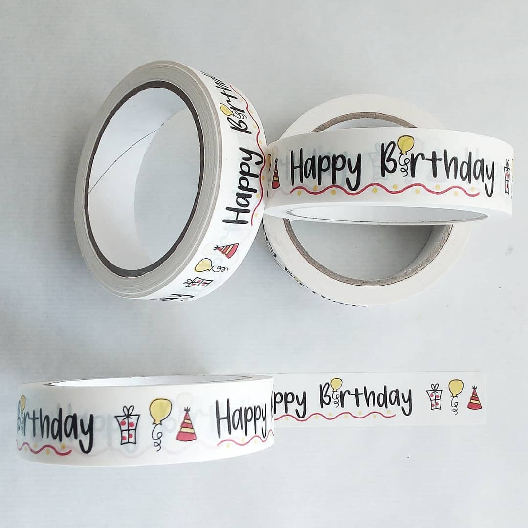 Happy Birthday Tape on White Kraft Paper Sticky Tape Roll - Standard 24mm Roll.
